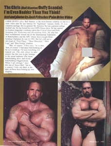 For instance, in Muscle Media 2000 magazine (August 1996), the outspoken bodybuilder “Rant” columnist, Dan Duchaine, wrote a very clever article titled “Asses, Glutes, Perverts, & Me.” Duchaine: “My old friend Chris Duffy had ‘glutes,’ and his girlfriend at the time would complain that he had too much muscle to pry his butt cheeks apart. But awhile ago, I saw Chris’ porn video, and it looked like Chris has learned to…relax!”